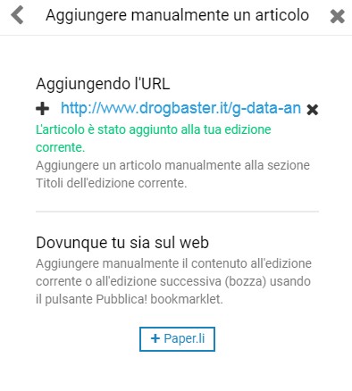 Dopo aver terminato di aggiungere contenuti al tuo giornale, puoi utilizzare è il bookmarklet Paper.li per aggiungere manualmente il contenuto all’edizione corrente o all’edizione successiva usando il pulsante +Paper.li .