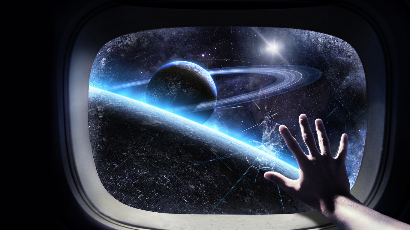 Vista di Saturno attraverso oblò di un'astronave
